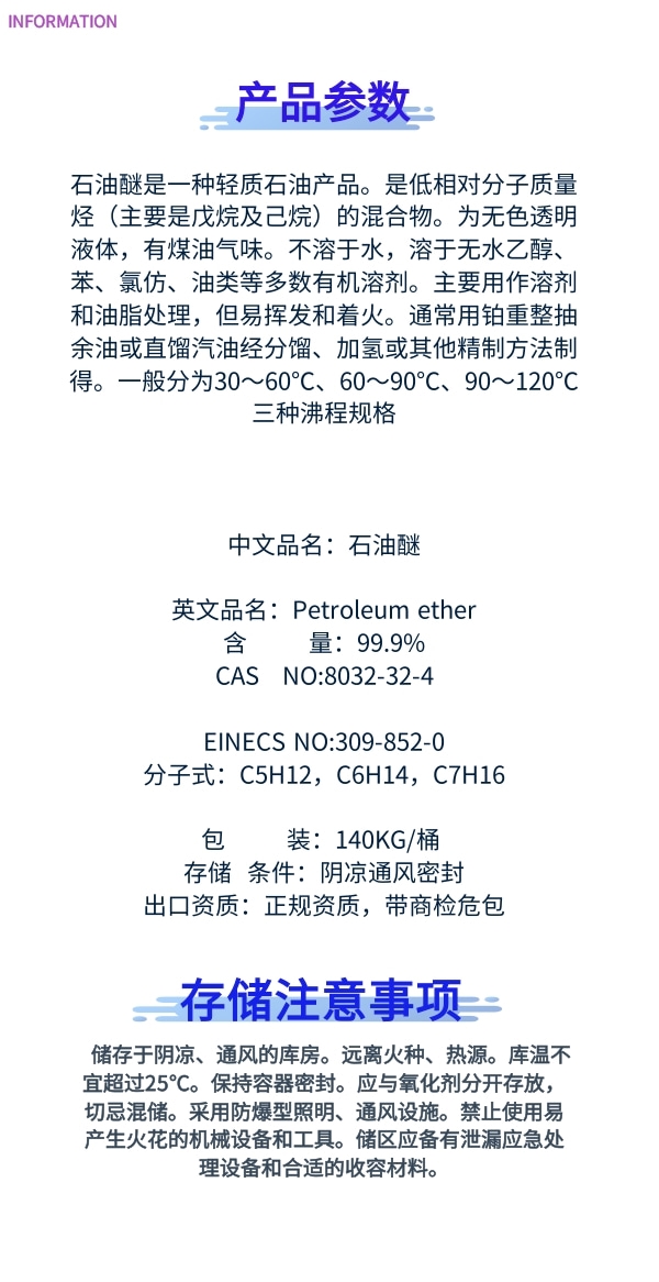 二次加氢石油醚特性:以油田优质轻烃为原料,采用连续精馏工艺生产而成,其主要成份有正庚烷、异庚烷和环庚烷,还含有少量的辛烷和己烷,常温常压下为液态,易燃易挥发。