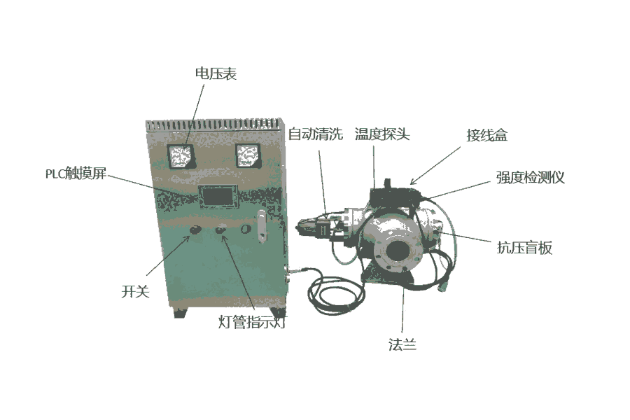 中压紫外线消毒设备反应器的控制功能均置于一个设备控制柜。PLC控制设备运行,并带有一个触屏式操作界面。软件的一个重要功能是控制紫外线消毒过程,监测设备状态并对故障及时报警。此故障保护设备保证了操作人员和设备的安全。 中压紫外线消毒设备的灭活效率由紫外线灯的光谱输出决定。在隐孢子虫进行灭活的紫外线光谱区中,中压紫外线消毒设备采用效的中压灯。每个紫外线消毒灯管均带有一个紫外线光强传感器。另一个中压紫外线消毒设备的关键技术是石英清洗技术。此设计的一个基础是一个不锈钢刷用于清洗石英表面并防止形成污垢层。 清洗装置由许多不锈钢毛刷,利用气压缸清洗器可前后活动。清洗器的运动频率可由控制面板上的操作界面调节。