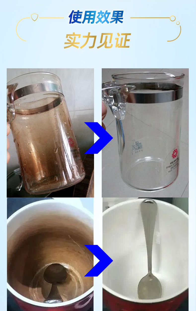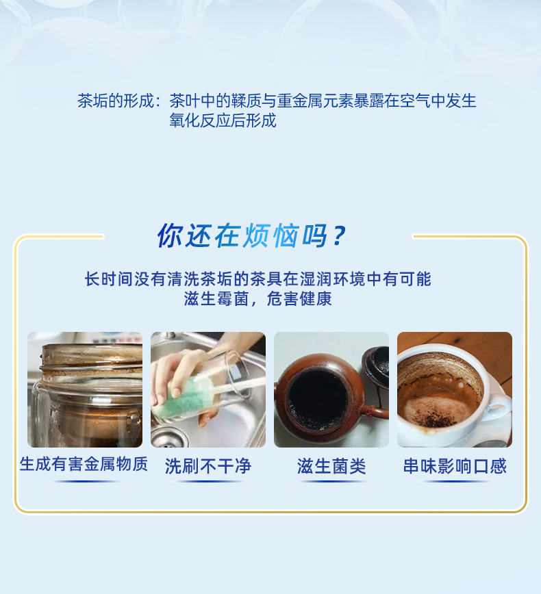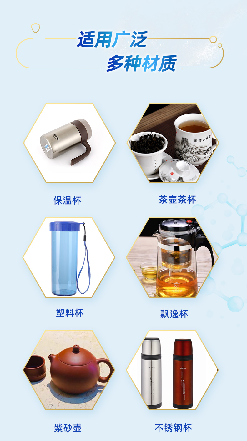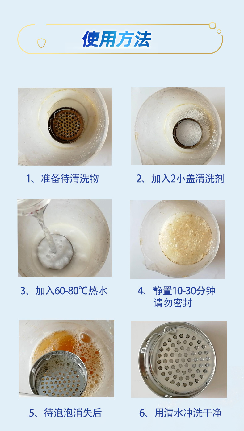 茶具除垢:本产品2小盖加入茶具中,加入60-80℃热水,静置10-30分钟后,用清水冲洗干净,如需对茶具进行全面清洗,可采用浸泡清洗的方式。