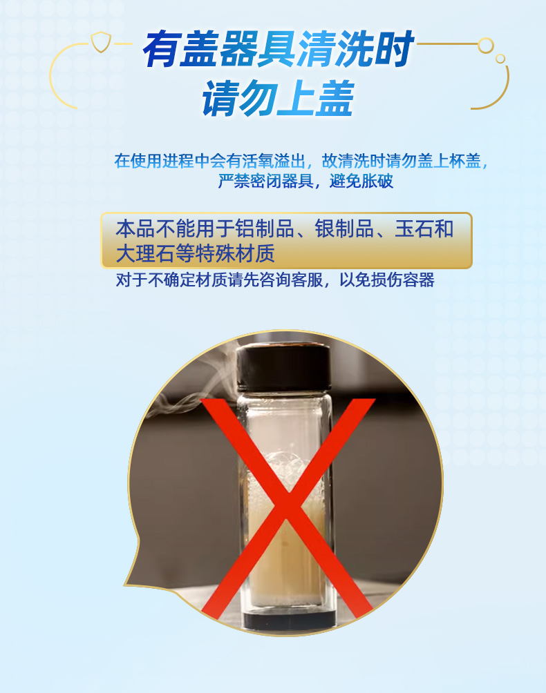 1.本品在使用进程中会有活氧溢出,故清洗时请勿盖上杯盖,严禁密闭器具,避免胀破。
