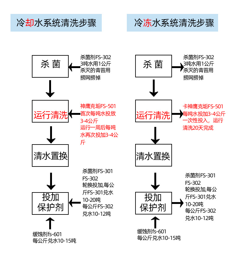2.冷却水系统每吨加清洗药剂5-8kg,冷冻水系统每吨加清洗药剂3-4kg,分别分两次加入。第一次加入计划药量的一半,运行15天后,排放一半污水。再补足清水,加入剩余的一半药剂,再运行10-20天后,用清水置换清洗废液至清澈。