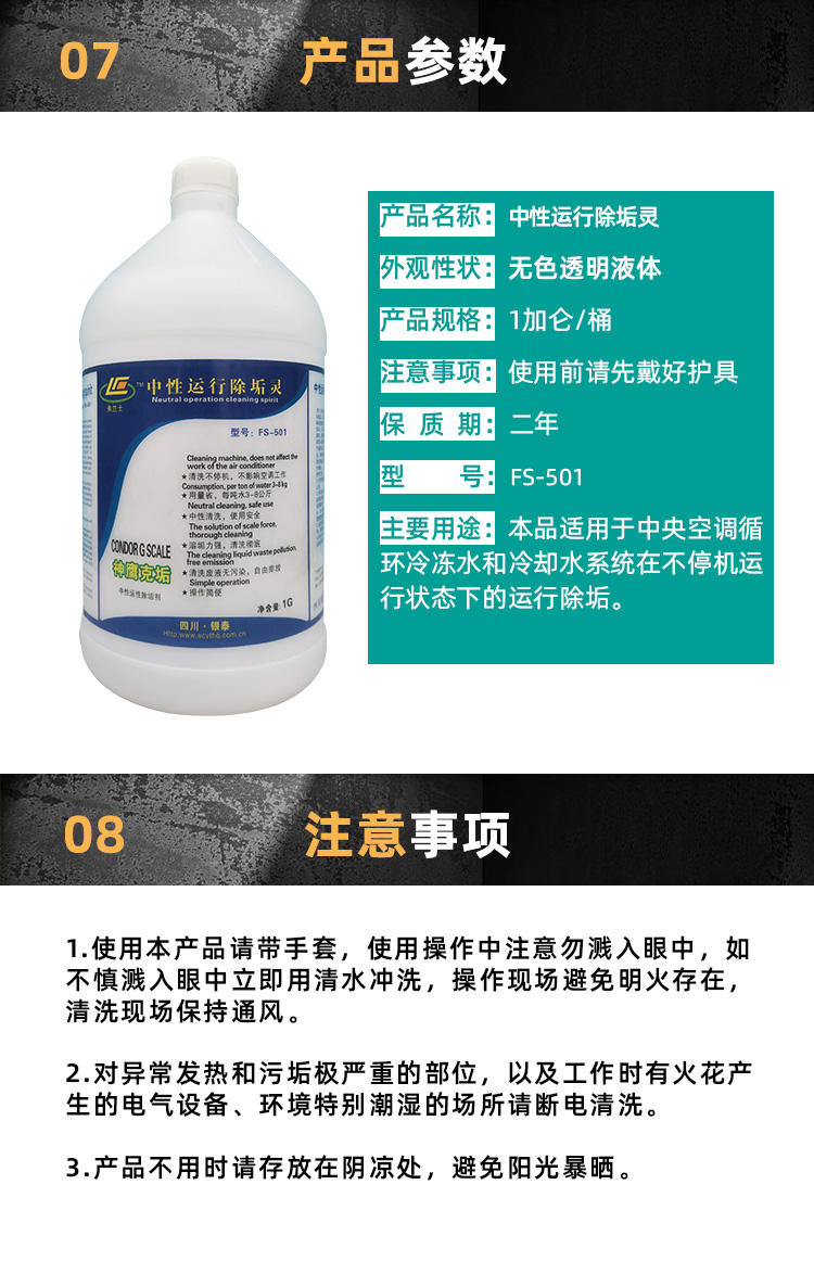 弗兰士系列产品受助于美国陶氏化学技术支持,及原材料供给,优化了产品质量。神鹰克垢(运行除垢灵.不停机除垢灵)的诞生是中央空调循环水系统清洗的一次革命。FS-501因操作简单,用量省,PH值中性,腐蚀率极小,难溶垢清洗能力强,废液自由排放等诸多优点而受人们的欢迎。