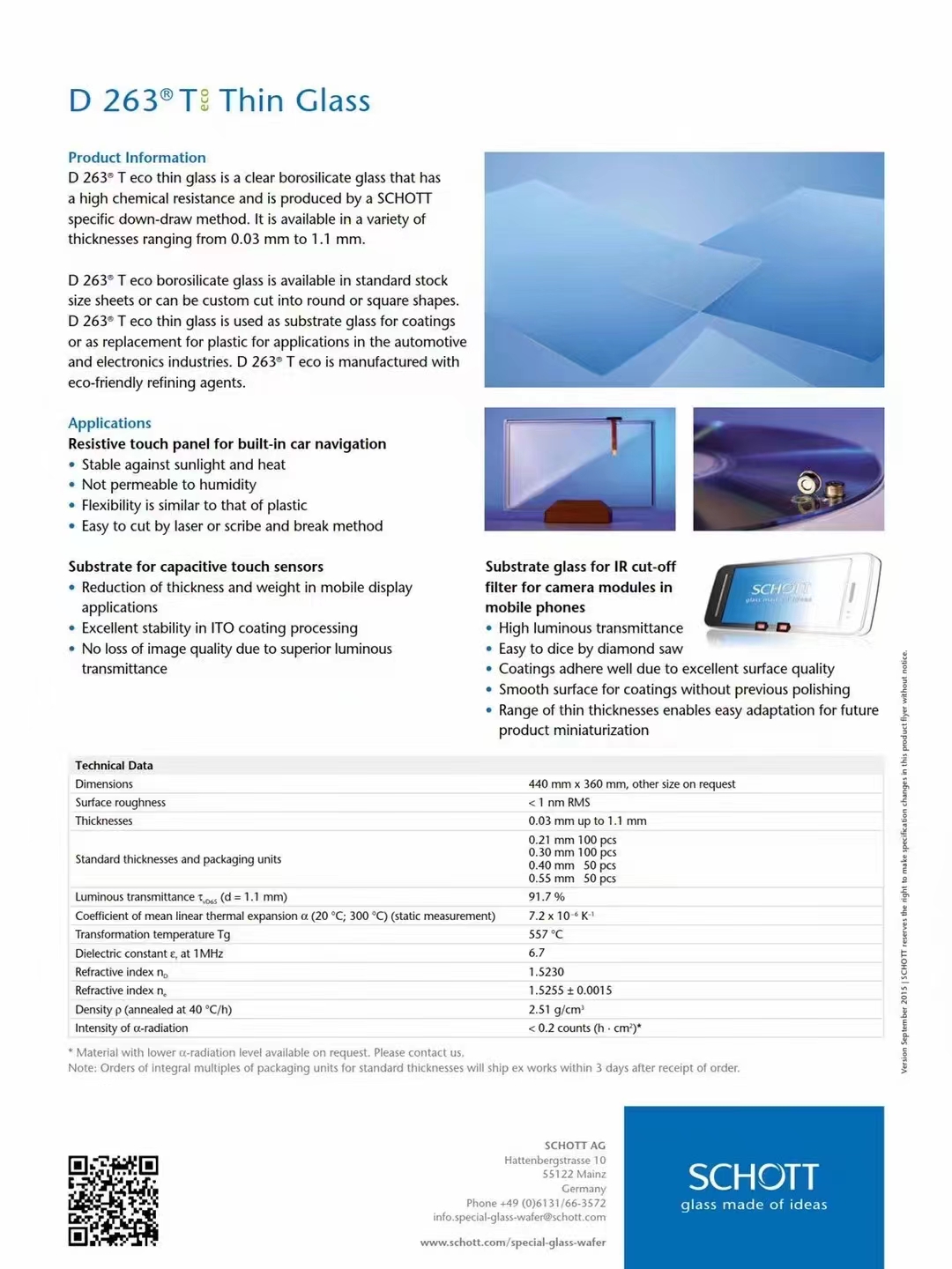 D263T玻璃有不同的厚度可供选择,包括0.1mm、0.145mm、0.175mm、0.21mm、0.3mm、0.4mm、0.5mm、0.55mm、0.7mm、0.9mm、1.1mm
