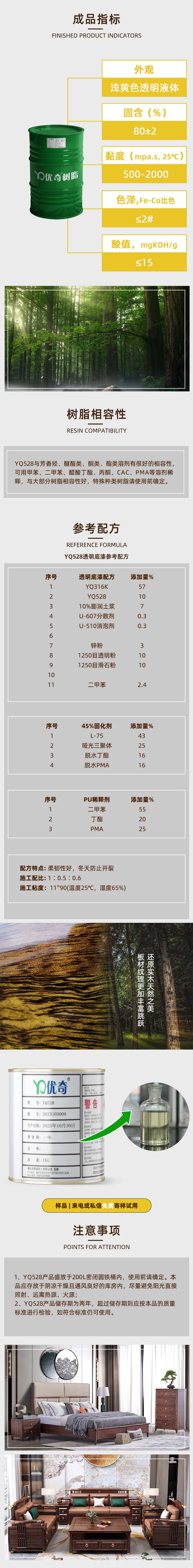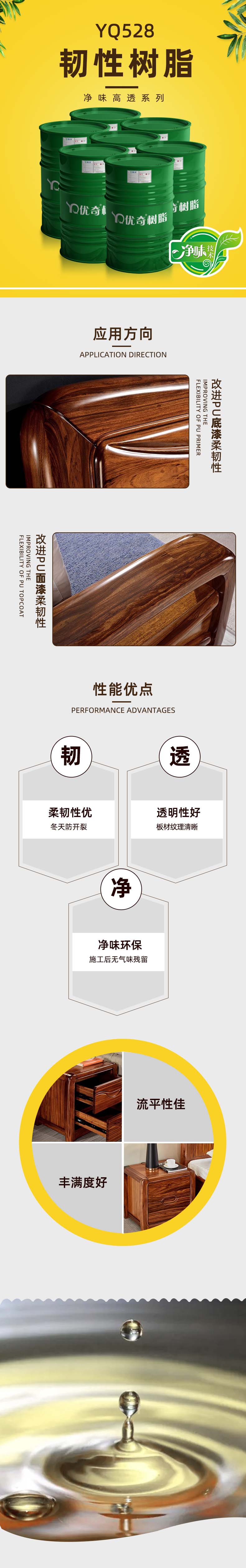 优奇528韧性树脂是特殊材料改性树脂,用于PU漆,具有柔韧性好、丰满度好、透明性好、流平性优异等优点,冬天防止开裂。