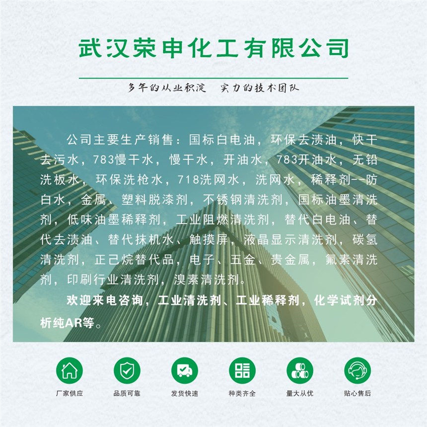 武汉荣申化工有限公司专业生产工业清洗剂,工业稀释剂,化工原料及化学试剂分析纯AR,欢迎来电咨询!