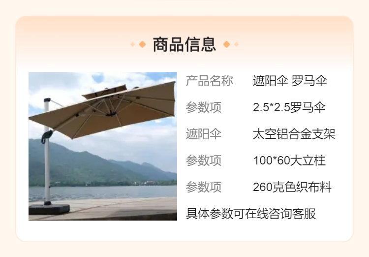 • 规格:2.5*2.5方形罗马伞