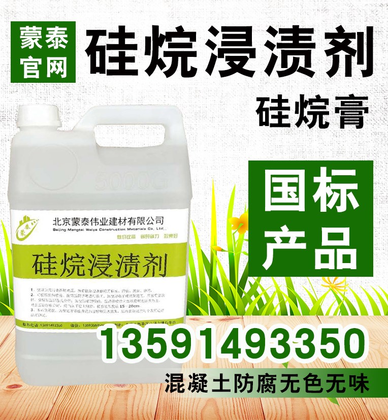 其具有的小分子结构可穿透胶结性表面,渗透到混凝土内部与暴露在酸性或碱性环境中的空气及基底中的水分子发生化学反应,形成牢固的高环保防水层,深层渗透,抑制水分吸收,产生防水、防Cl-、抗紫外线的性能且具有透气性。可有效防止基材因渗水、日照、酸雨、除冰盐和海水的侵蚀而对混凝土及内部钢筋结构的腐蚀、疏松、剥落、霉变而引发的病变,提高建筑物的使用寿命。浇注不久的混凝土等碱性环境,会刺激该反应并加速斥水层的形成。经保护的基材具有良好的斥水性,并保留原有的外观。目前已有实际工程混凝土结构经过15~20年的保护效果依然完好的记录。