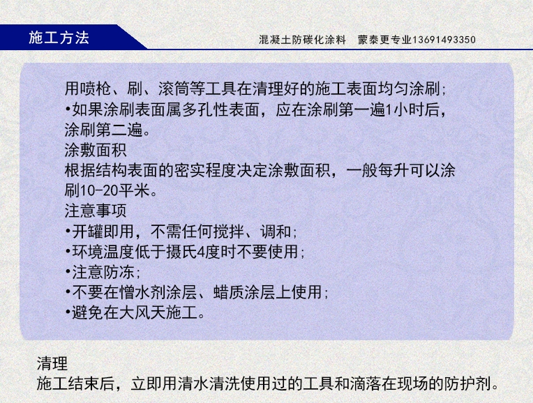 施工结束后,立即用清水清洗使用过的工具和滴落在现场的防护剂。