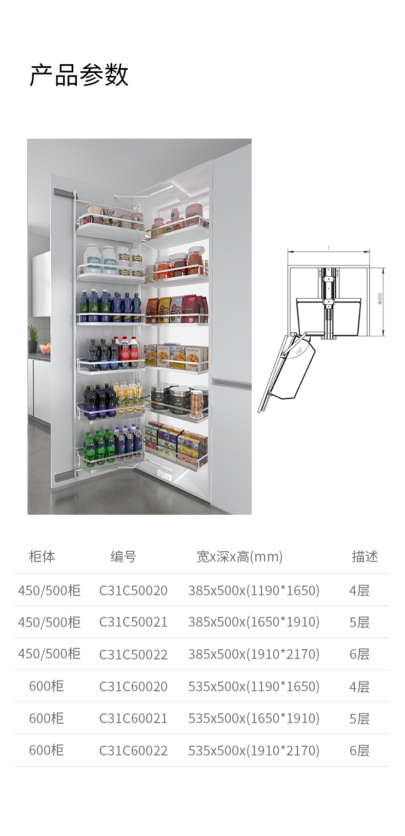 柜门与篮体采用连动设计,在开门的同时带出整套的篮子,方便存储物品。采用重型滑轨,载重更加强力,始终保存平稳、顺滑。