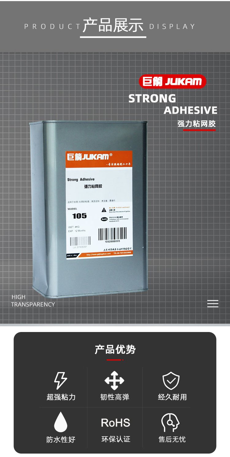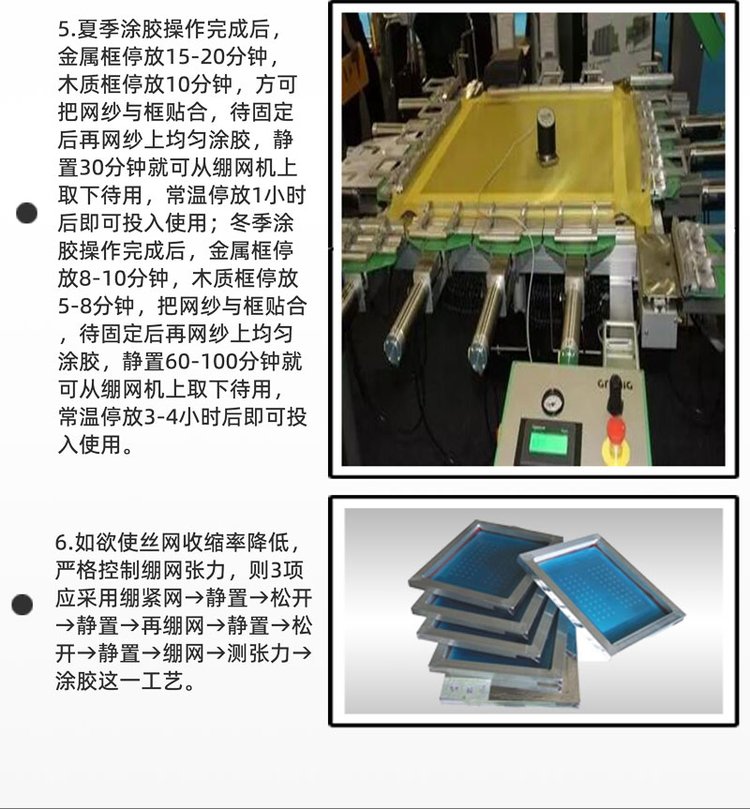 粘合材料 | 涤纶网纱,尼龙丝网,聚酯丝网,不锈钢丝网与各种木材,金属(铝、钢、镀锌铁等)网框的粘结 | ||