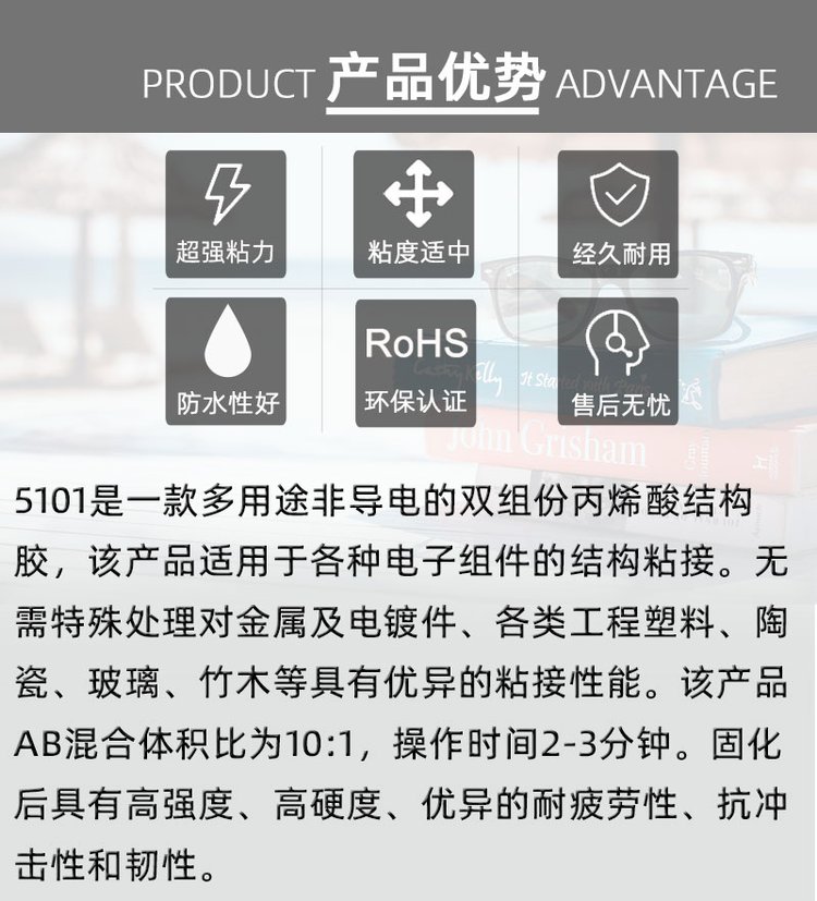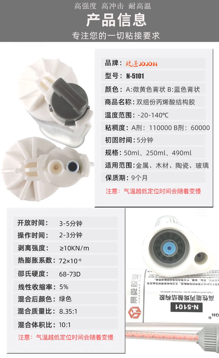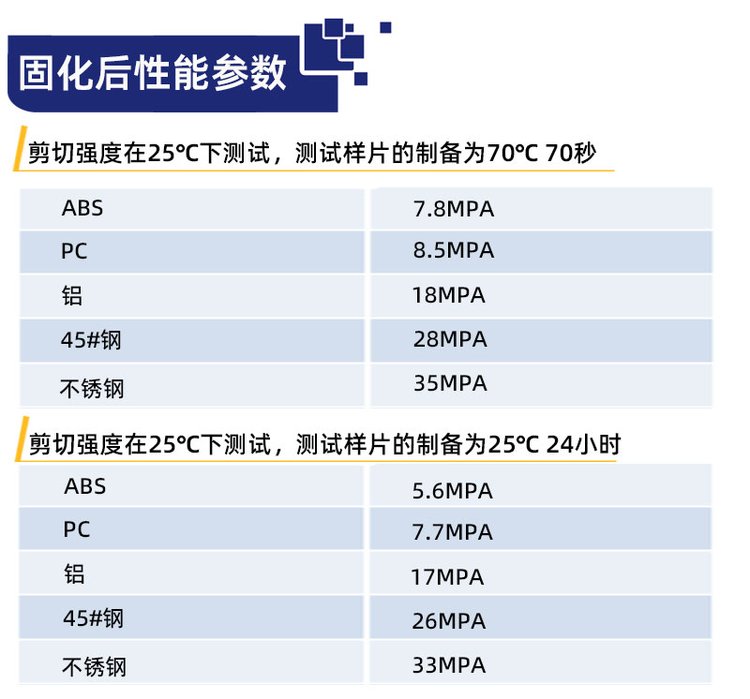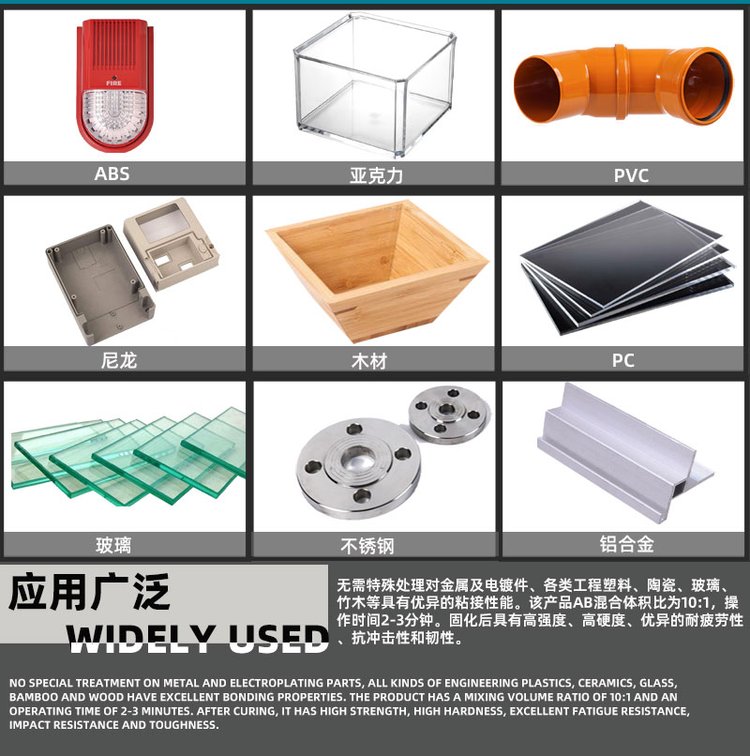 粘合材料 | 粘不锈钢 铝合金 铜 铁 45#钢 ABS PC 尼龙 PBT 玻璃 木材 陶瓷等 | ||