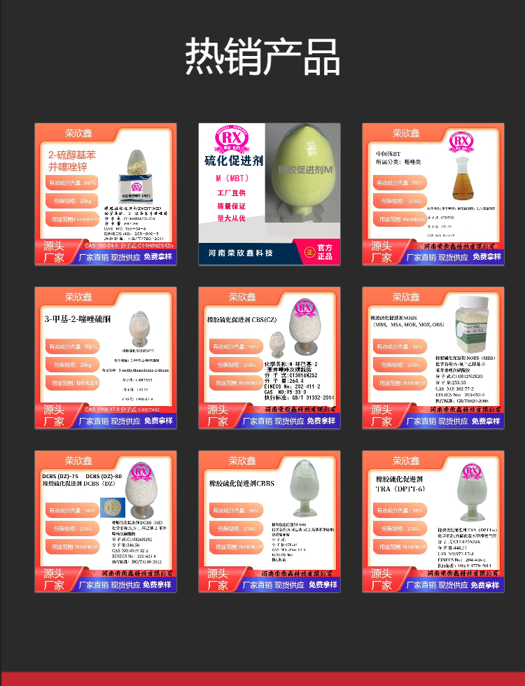 产品特性 | 本品是天然胶、顺丁胶、异戊胶、丁苯胶与再生胶的后效性促进剂,尤其适用于含碱性较强的炭黑胶料。操作温度下安全,抗焦烧性强、硫化速度快,定伸强度高,能提高合成胶的使用比例。低毒高效,是NOBS理想的替代品,具有优异的综合性能,被称为标准促进剂。广泛用于子午线轮胎的生产。 | ||