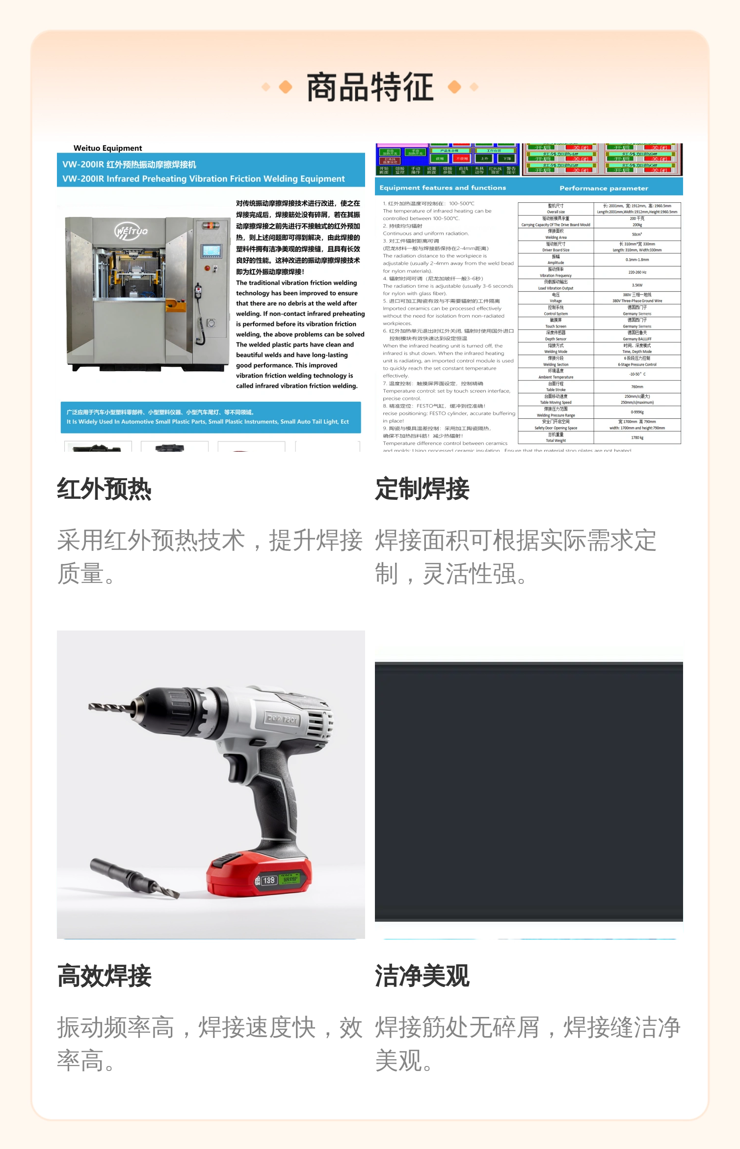 焊接特点 | 焊接筋处无碎屑,焊接缝洁净美观 | ||