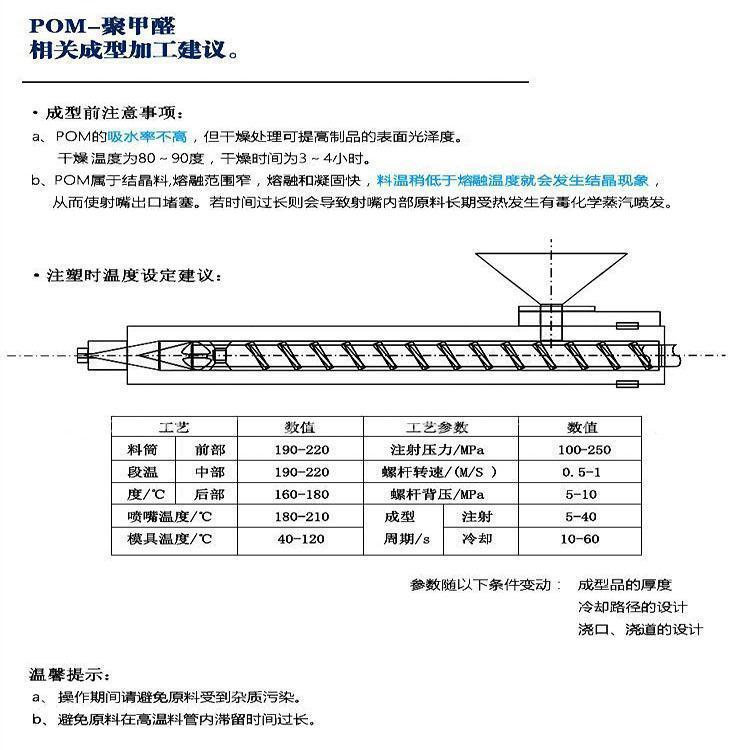 1、POM为乳白色不透明结晶性线性热塑性树脂,具有良好的综合性能和着色性,具有较高的弹性模量,很高的刚性和硬度,比强度和比刚性接近于金属;