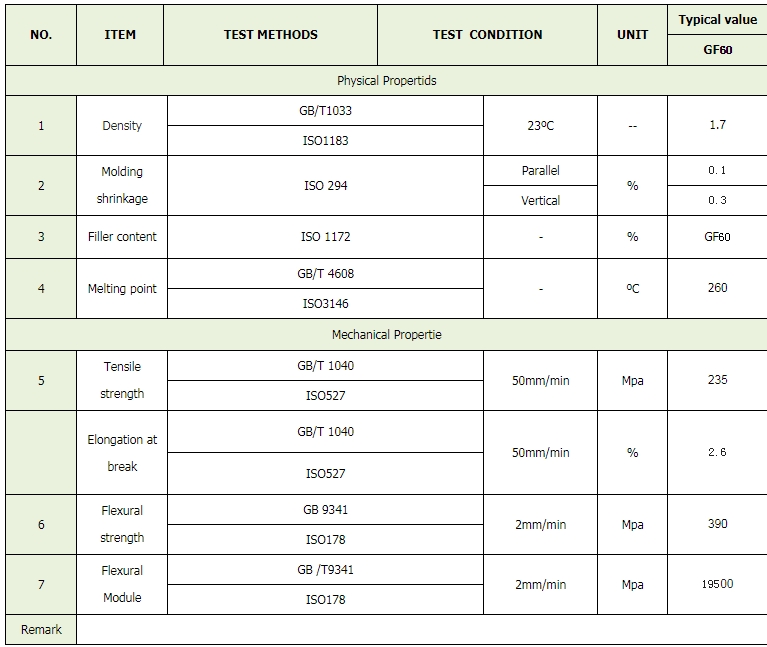尼龙PA66加百分之60玻纤改性增强系列的参数表: