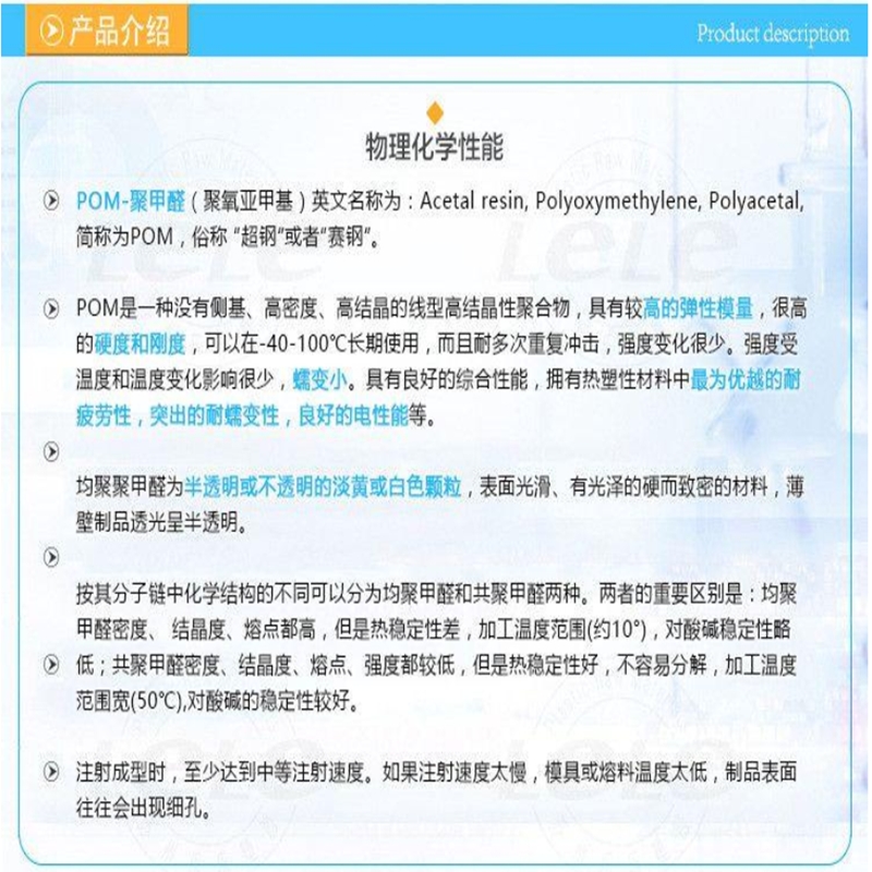 聚甲醛是一种没有侧链、高密度、高结晶性的线型聚合物。按其分子链中化学结构的不同,可分为均聚甲醛和共聚甲醛两种。两者的重要区别是:均聚甲醛密度、结晶度、熔点都高,但热稳定性差,加工温度范围窄(约10℃),对酸碱稳定性略低;而共聚甲醛密度、结晶度、熔点、强度都较低,但热稳定性好,不易分解,加工温度范围宽(约50℃),对酸碱稳定性较好。是具有优异的综合性能的工程塑料。有良好的物理、机械和化学性能,尤其是有优异的耐摩擦性能。俗称赛钢或夺钢,为第三大通用塑料。
