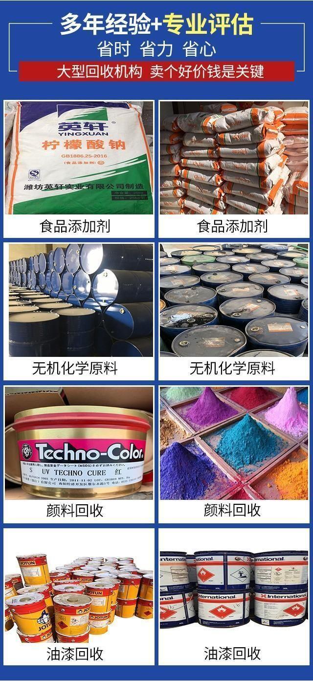 我公司面向全国长期高价回收染料,颜料,船舶油漆,工程油漆,胶印油墨,树脂,溶剂,橡胶,橡胶促进剂,橡胶防老剂,石蜡,硬脂酸,塑料助剂,塑料颗粒,工程塑料日化洗涤原料,香精香料,食品添加剂,重金属试剂,超市下架各种食用油,机油,柴油,齿轮油,导热油等各种库存积压废旧过期化工原料,当天联系,次日上门看货,现金交易,高效快捷,安全可靠!同时便宜出各种化工原料!诚营,砥砺前行。欢迎您的来电,期待与您合作!