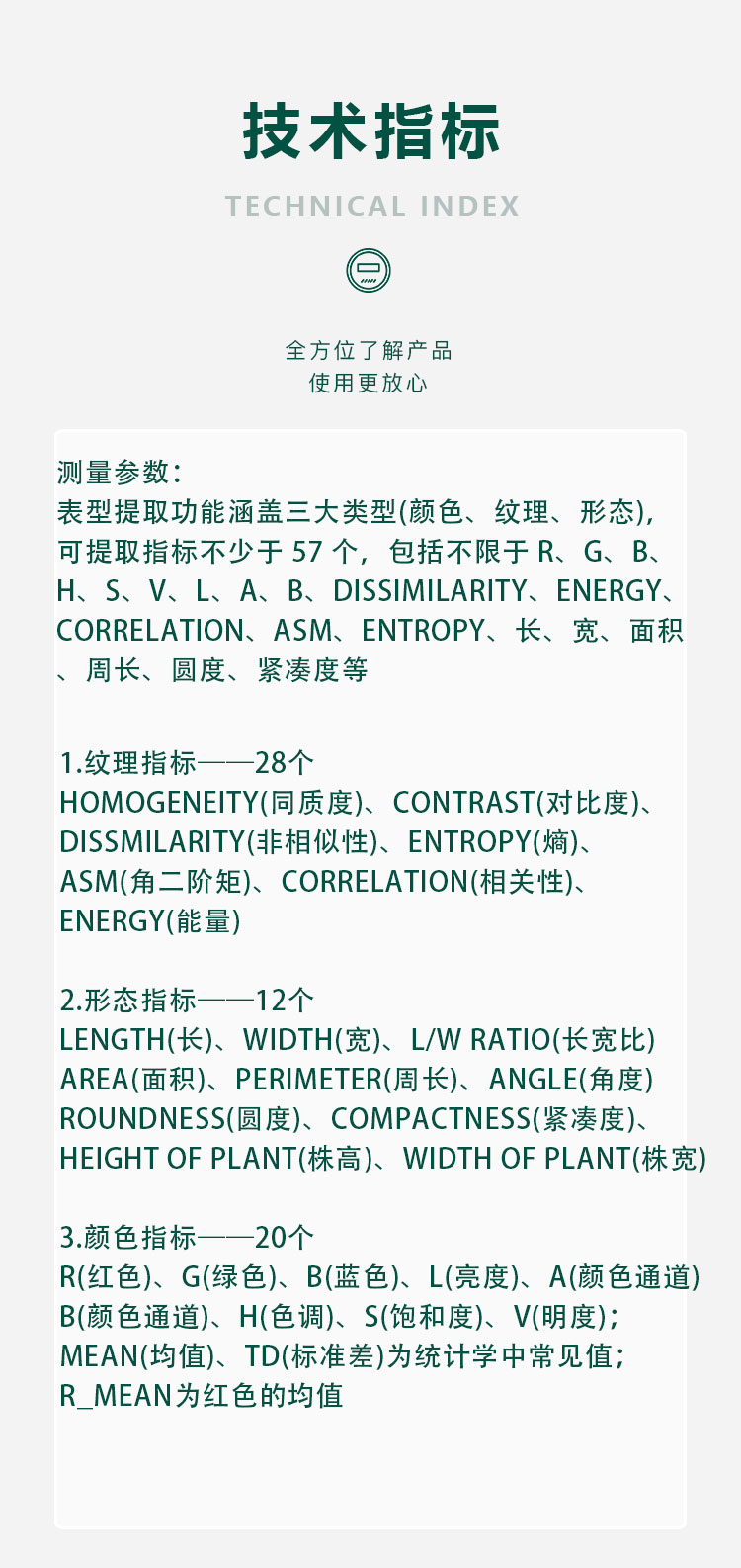 测量参数 | 表型提取功能涵盖三大类型(颜色、纹理、形态),可提取指标不少于 57 个长、宽、面积、周长、圆度、紧凑度等 | ||