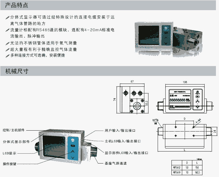 产品简介:MF5600系列质量流量计专门为需要显示器和表体分离的应用需求而设计的。例如医院供氧系统小型空分系统。该流量计的标准工业用户界面(RS485/4~20mA)及用户自定报警功能更好实现的异地或网络监控。现有的产品是MF5612和MF5619可分别测量0-300SLPM和0-800SLPM气体流量。 有什么技术请联系广州铭鸿自动化仪表有限公司,