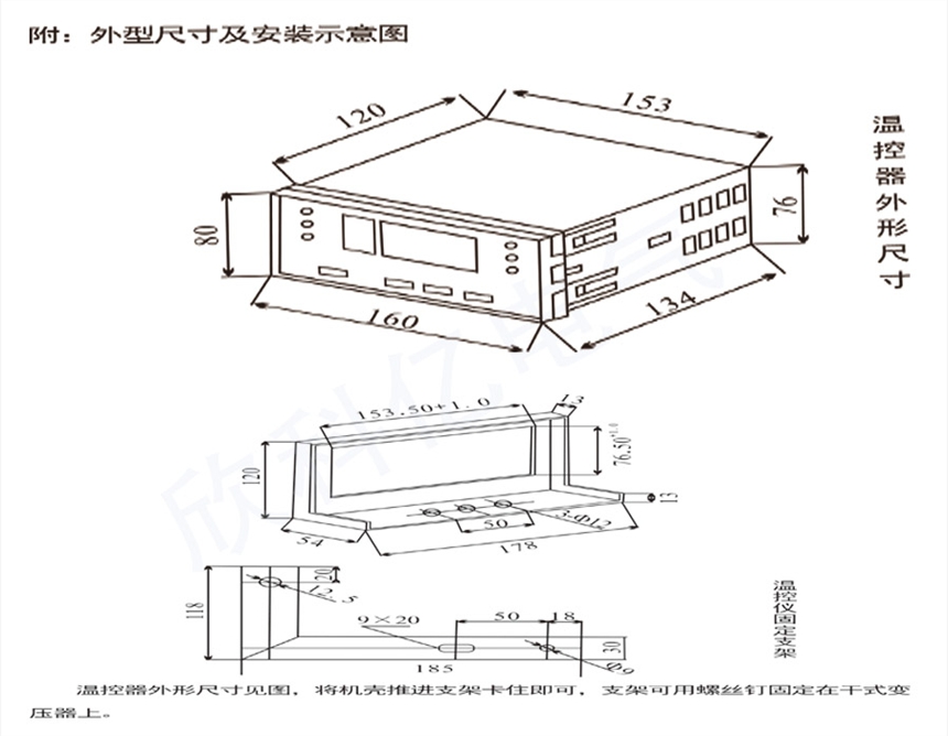 11.设备外型尺寸 80×160×120mm,嵌装开孔尺寸:154×77mm