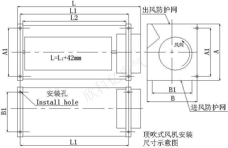 顶吹式风机外形及安装尺寸图: