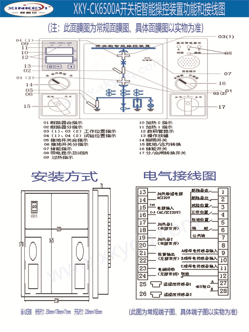 ??????XKY-CK6500A开关柜智能操控装置功能强大、用于0.4KV-35kV 户内开关柜,取代现有的一次回路模拟图、温湿度控制器,高压带电闭锁装置,全功能语音防误提示和告警,配有合闸、分闸、储能、远方/就地、照明开关。高亮度LED显示器,显示当前温度、湿度值。可选RS485通讯接口,通讯协议为MODBUS通讯协议。适用于中置柜、手车柜、固定柜、环网柜等多种开关柜。同时本装置外观精致,美观、简化、美化了开关柜面板,有效地提升开关柜品质。