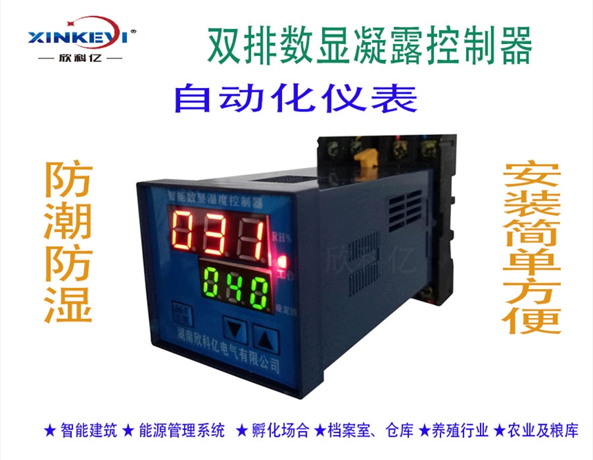 主要用于中高压开关柜、端子箱、环网柜、箱变等设备内部湿度的调节控制。可防止因设备受潮或结露引起的爬电、闪络事故的发生。智能湿度控制器带有一路凝露传感器,随时监测被测环境内部的湿度变化,并可通过设定方式对小环境内湿度进行自动控制。