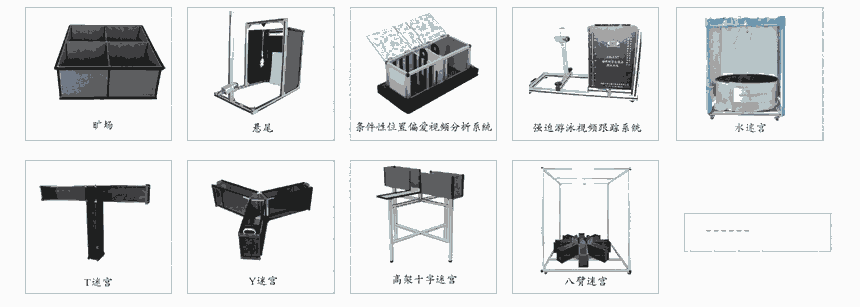黑白箱实验分析系统、悬尾实验视频分析系统、大小鼠步态行为分析系统、高架十字迷宫分析系统、强迫游泳实验视频分析系统、动物三箱社交行为分析系统、洞板系统、疼痛自动分析系统、 Y迷宫视频分析系统、八臂迷宫实验视频分析系统、穿梭实验视频分析系统、T迷宫视频分析系统、Morris水迷宫系统、Barnes巴恩斯迷宫视频分析系统、新物体识别实验系统、条件性位置偏爱视频分析系统