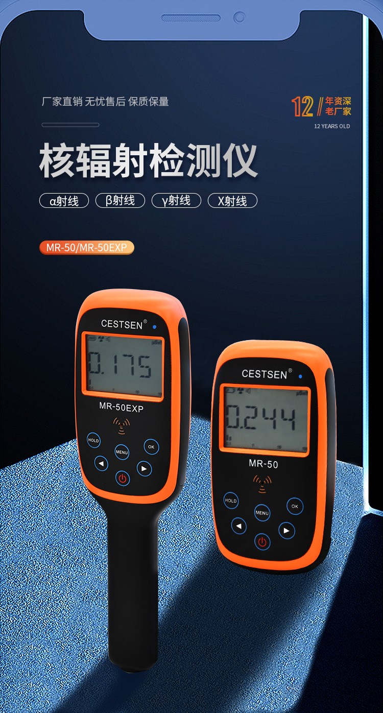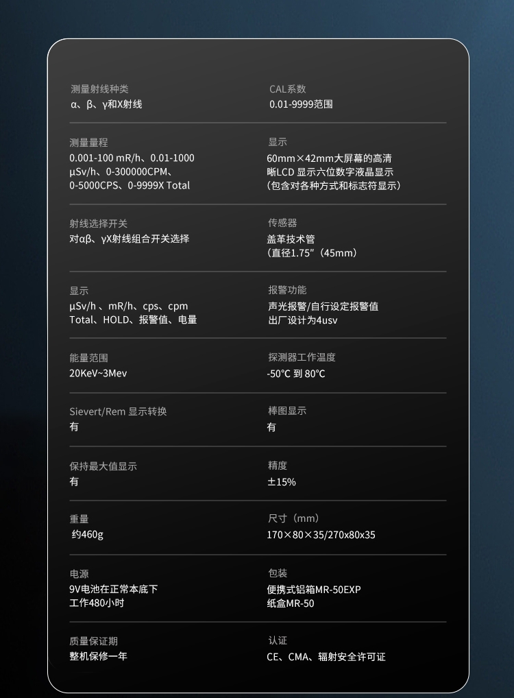 测量射线种类 | α、β、γ和Χ射线 | 测量范围 |