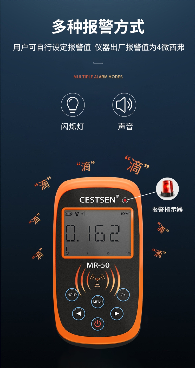 声光报警(用户可自行设定报警值,出厂设置为1μSv/h) |