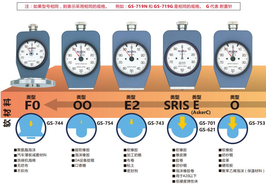 这是TECLOCK的原创标准,量测得到的值为接近 A 型的橡胶硬度值。