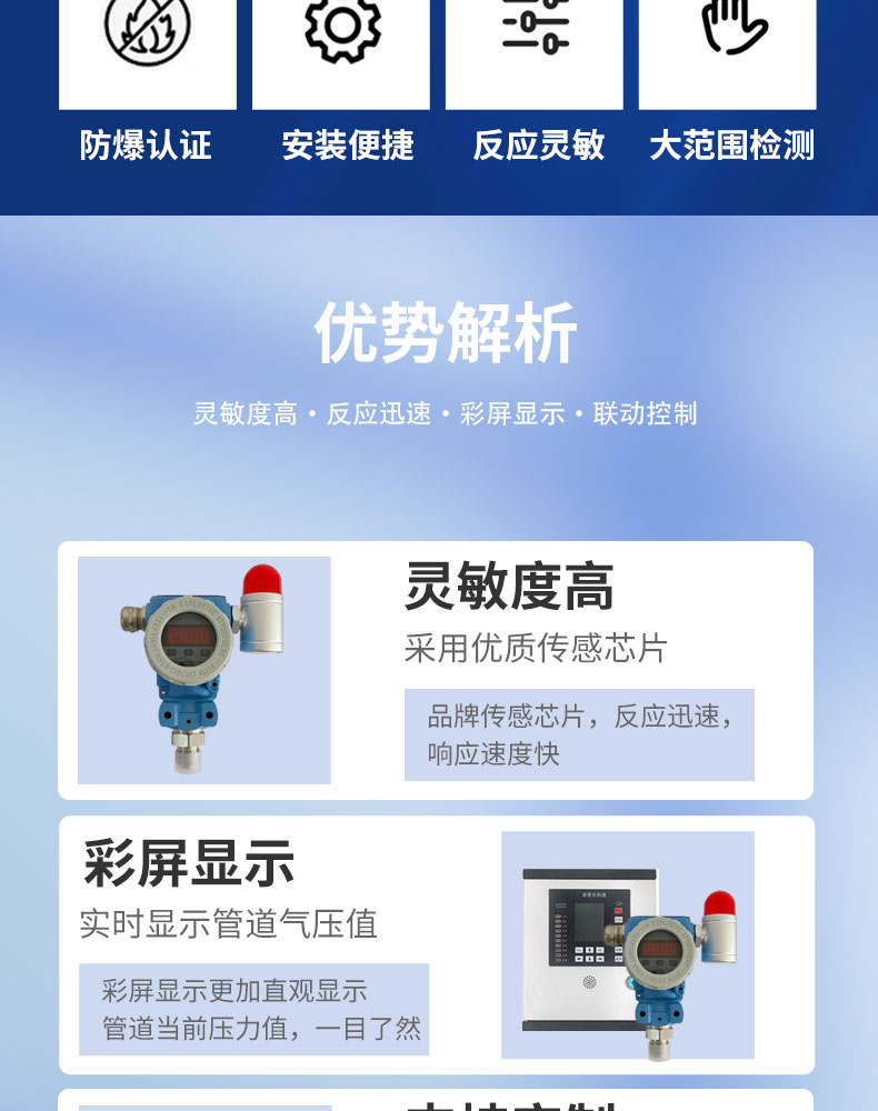 智能压力测控变送产品质量稳定,性能突出,具有非常强的抗干扰特性主要功能包括 4-20mA 变送输出、两路继电器开关量输出、现场显示功能、高低压报警与紧急切断功能。采用 SMT 工艺和集成设计理念,对传感器