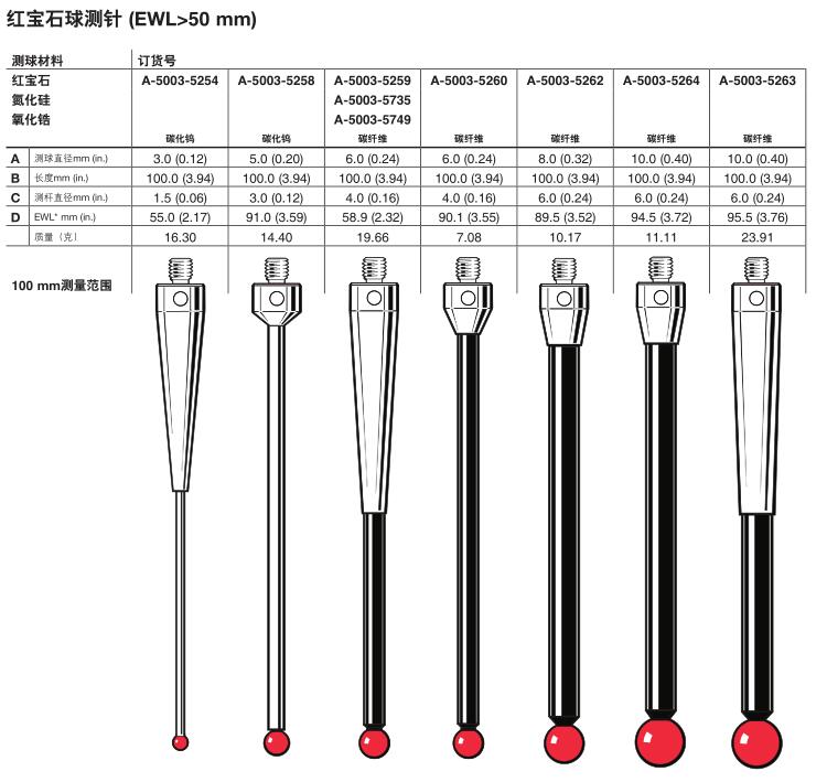红宝石是一种ji为坚硬的材料,因此测球的磨损甚微。它还具有较低密度,使测尖的质量MIN,从而避免了因设备运行或振动而引起测头的误触发。