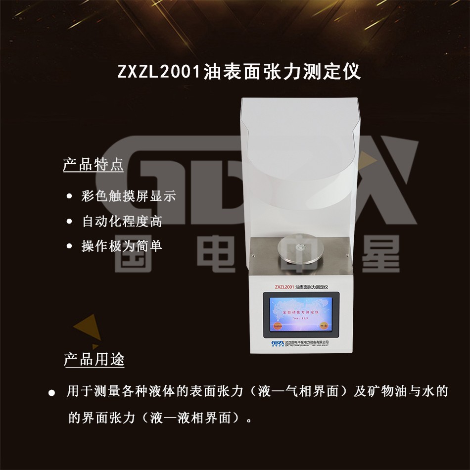ZXZL2001油表面张力测定仪按照GB6541-86《石油产品油对水界面张力测定法》(圆环法)标准要求,测量各种液体的表面张力(液—气相界面)及矿物油与水的界面张力(液—液相界面)。仪器采用彩色触摸屏显示,全汉字菜单提示的无标识按键,自动化程度高,工作可靠,重复性好,操作极为简单,只需开机后按菜单提示操作,便可完成全部试验。