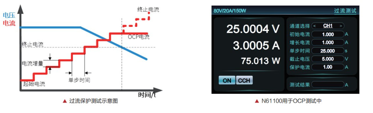 OCP测试时,负载以恒电流模式进行拉载,同时检查被测物电压是否低于终止电压。如被测物电压低于截止电压,则记录此时的拉载电流作为测试结果,并关闭输入,停止测试;如被测物电压高于截止电压,负载增加拉载电流,直到电压低于截止电压或达到最大拉载电流。