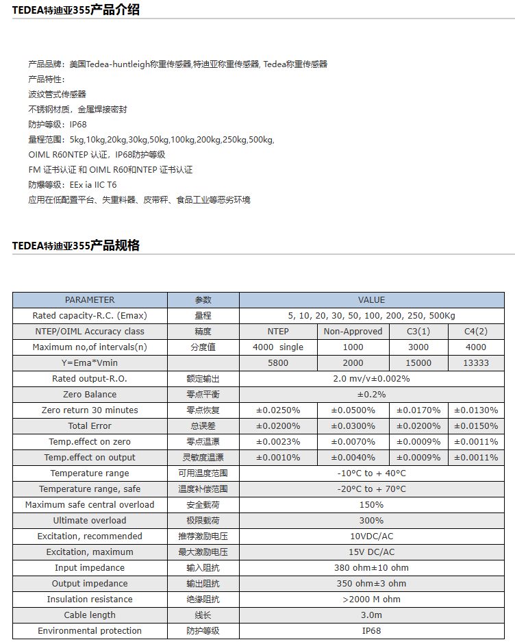 特迪亚-亨特利/Tedea-huntleigh 1002称重传感器系列型号: