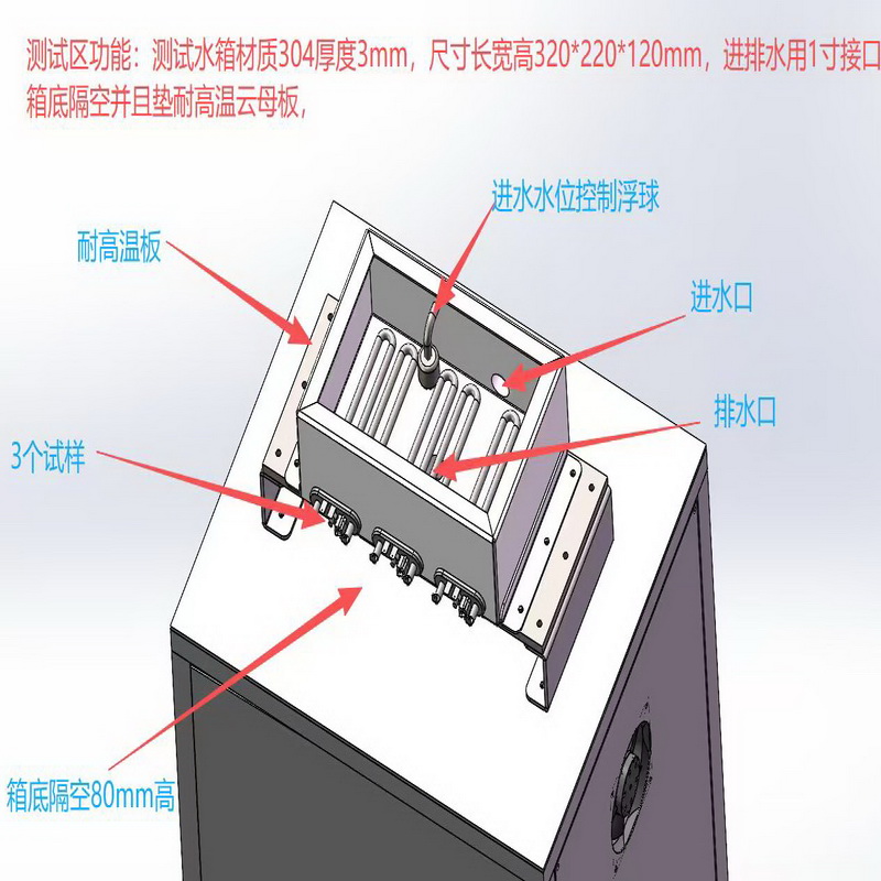 测试过程:触摸屏设定测试电压使产品达到1.15倍功率(这个我们是从调整电压算的吧。比如算出来1.15倍的时候电压230V),给产品加热。当达到设定温度后(MAX高1000度),切断电源,2秒内用水浸没产品降温,1分钟后排水。继续通电进行下一个循环