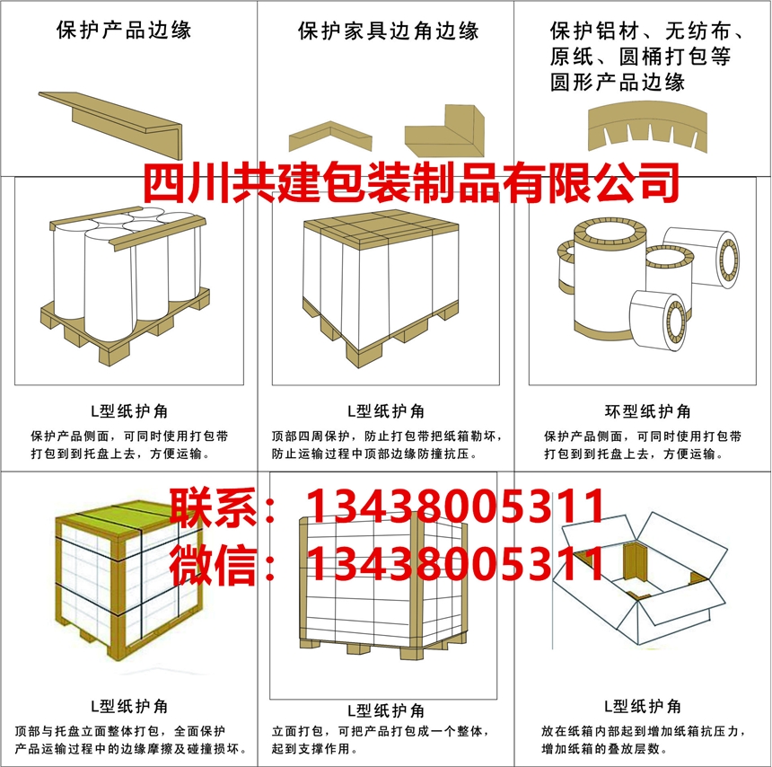 2、预防外部损害,若使用纸护角仅是为了保护表面,而不需要加固时,厚度有3mm即可,其尺寸可按货物的尺寸来确定,为降低成本,还可以用一些小的护角保护因打包带过紧的边角损坏。