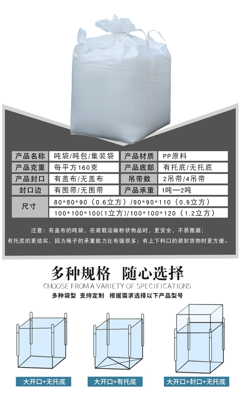 工业盐集装袋 上敞口底料口吨袋 展辉吨包厂生产定制,集装袋产品应用面很广,特别是包装散装的水泥、粮食、化工原料、饲料、淀粉、矿物等粉、粒状物体,甚至于电石之类的危险品,装卸、运输、贮存,都非常方便。集装袋产品正处于发展的上升阶段,特别是一吨装、托盘形式(一只托盘装一个集装袋,或装四个)的集装袋,更加受人欢迎。