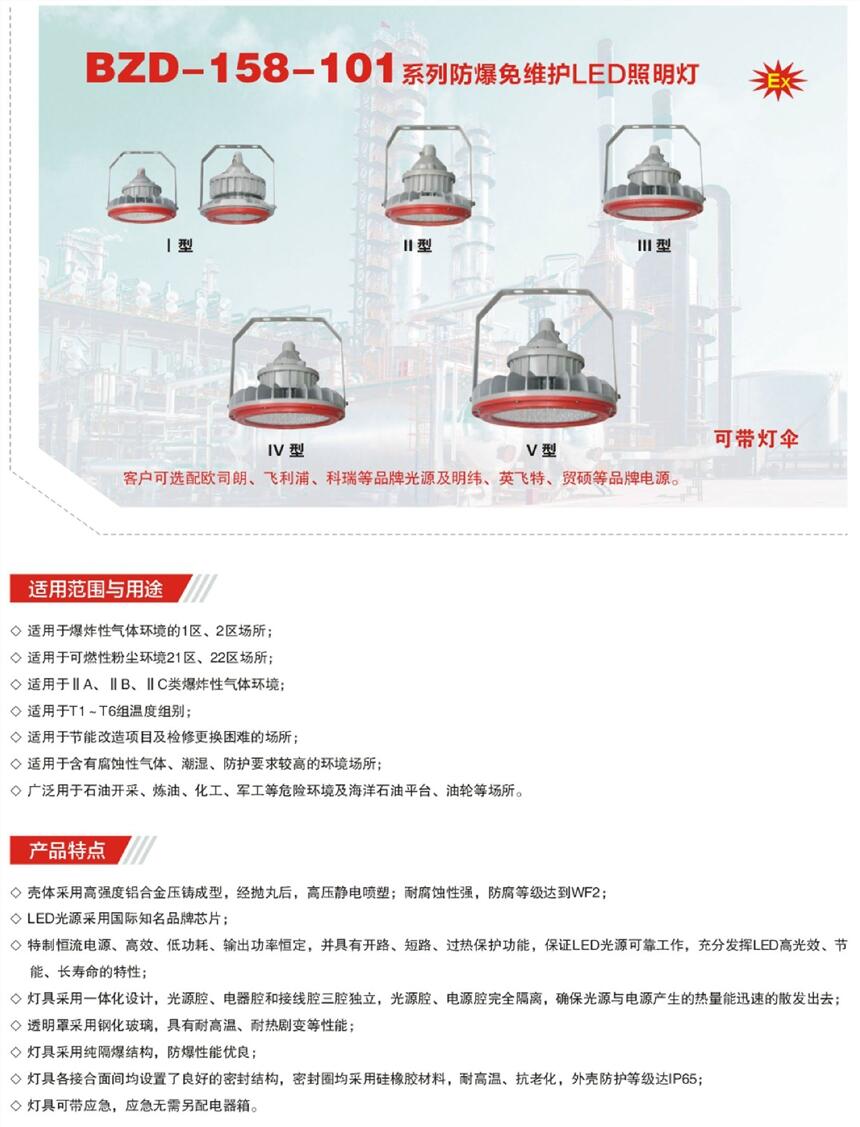 适用于T1~T6温度组别;适用于含有腐蚀性气体、潮湿、防护要求较高的环境场所;