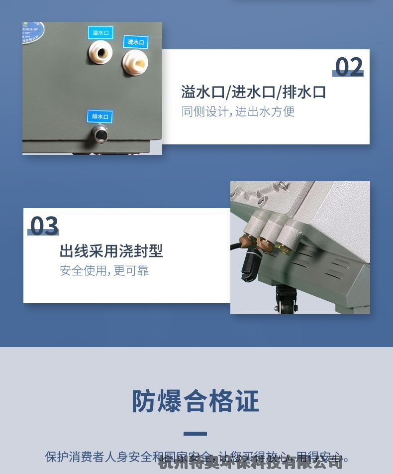 防爆措施:加湿机内的电器元件、电气控制部分及风扇电机均采取专用的防爆结构处理(隔爆型),电磁阀、出线及高低压压力开关采用浇封型,操作面板及管温、环温传感器等均采用其独有的本质安全型,防爆要点可靠突出。