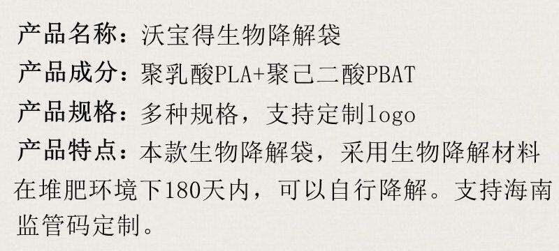 沃宝得可降解购物袋,采用生物降解材料,聚乳酸PLA和聚己二酸PBAT。可降解购物袋使用后,在堆肥环境下,可以自行降解成二氧化碳、水等物质,不会像塑料PE购物袋那样成为“白色污染”。