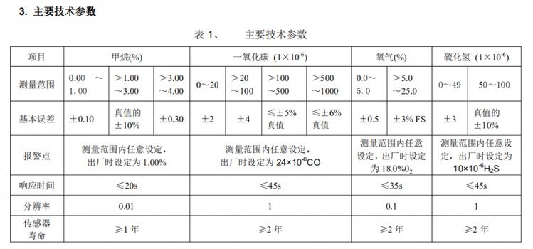 1.3?产品执行标准?GB 3836.1-2010《爆炸性环境 第?1?部分:设备 通用要求》?GB 3836.2-2010《爆炸性环境 第?2?部分:由隔爆外壳“d”保护的设备》?GB 3836.4-2010《爆炸性环境 第?4?部分:由本质安全型“i”保护的设备》?AQ 6207-2007《便携式载体催化甲烷检测报警仪》?MT 703-2008《煤矿用携带型电化学式一氧化碳测定器》?MT 704-2008《煤矿用携带型电化学式氧气测定器》?MT 1084-2008《煤矿用硫化氢检测报警仪》?Q/ZA 14-2018《CD4?多参数气体测定器》。?
