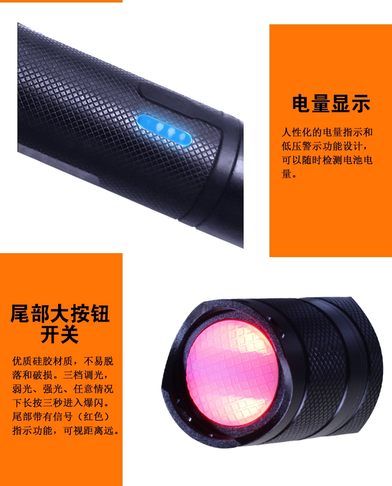 电量检测:人性化的电量指示和低电压警示功能设计,可随时检测电池电量;当电量不足时,灯具会自动提示15次进行充电;