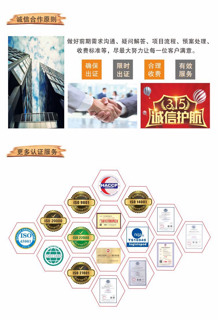 我司专注于企业认证咨询一体化服务,提供iso9001、iso14001、ohsas45001、haccp、iso22000等管理体系认证咨询和有机产品、中国绿色食品认证咨询、CCC认证、建筑企业资质新办、增项、升级的咨询机构。 公司还涉及科技项目咨询申报、知识产权顾问、商标、高新技术企业等代理申报和企业形象策划、企业管理培训,在省内享有较高的声誉,得到广大客户的信赖与支持。公司将一如既往继续努力,本着“诚信、专业、、高效”的宗旨为广大客户服务! 客户的要求是我们的服务之本,不断满足客户的要求并超越客户的期望是我们不断进步的动力,臻赞企业将和您一起迎接这充满挑战的市场,使我们的新老客户永远保持竞争的优势!