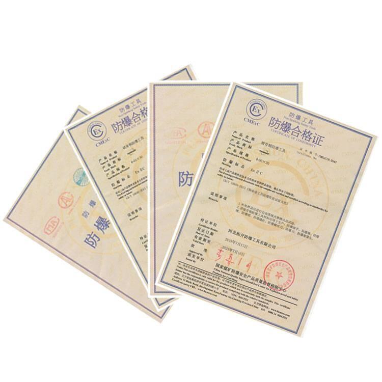 材质:铝青铜、铍青铜 ??铝青铜材质,工作面硬度HRC25°以上,抗拉强不低于δ b 75-85kgf/mm2属国家ⅡB级产品,在浓度7.8%的乙烯气体中作业不引爆气体; 铍青铜材质,工作面硬度HRC35°以上,抗拉强度δ b>105-120kgf/mm2,属国家ⅡC级产品,在浓度21%的氢气中作业不引爆气体;铍铜合金防爆工具还具备特殊的防磁功能,在有磁场的工作环境中能够正常使用。 以上两种材质防爆工具能有效的防止工具与工作物相互摩擦、撞击时产生的可燃性爆炸,确保国家财产和人身安全! 适用场所:石油、化工、矿山、防恐怖、防磁场、煤矿、采气、油气管道、发电、冶金、军工、航空、储运、制药、制气、塑料、化纤、皮革、烟火、爆竹等