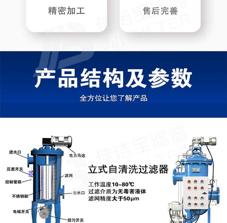 原理 | 水从进水口进入滤筒内部,杂质被拦截在过滤筒内壁,过滤后的净水从出水口流出,当滤筒内壁的杂质越积越多时,过滤器进出口的压差达到预设值、或达到清洗时间、或手动预制时,过滤器将开始自动清洗 | ||
