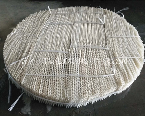 增强聚丙烯孔板波纹规整填料是在直接投放客户所需要的增强聚丙烯粉末至注塑机直接成所需厚度的塑料薄片,裁剪一定宽度后根据客户需要使用压孔机压有一定开孔率的小孔、辗轧特质的小纹,轧出一定波峰波矩的大波纹经裁剪后相邻两片应该旋转180°叠放,最后组装而成的规整填料,该填料的选择基于操作条件。波纹板形状为一种改进型波纹,波纹板垂直安装,与容器纵轴线平行,板上的波纹走向与板片长度方向成30°-60°,相同的波纹板上的波纹互相平行,相邻两板间的波纹成交叉状,流体流入此部分时作向上或向下运动,有助于分散相液滴的聚结、浮升或沉降,大大的提高了处理能力和分离效率。广泛用于吸收和解吸过程。亦用于废气净化及换热过程,它适用于大液体负荷和高操作压力的过程;油田及炼油厂的油水分离过程