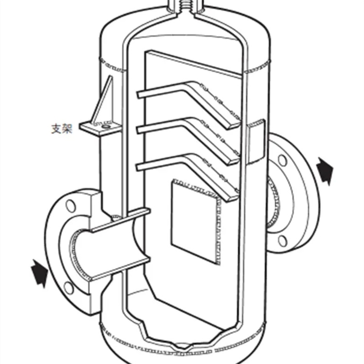 挡板分离器由很多挡板构成,流体在分离器内多次改变流动方向,由于悬浮的水滴有较大的质量和惯性,当遇到挡板流动方向改变时,干燥气体可以绕过挡板继续向前,而水滴就会积聚在挡板上,汽水分离器有很大的通流面积,减少了水滴的动能,大部分都会凝聚,最后落到分离器的底部,通过疏水阀排出。