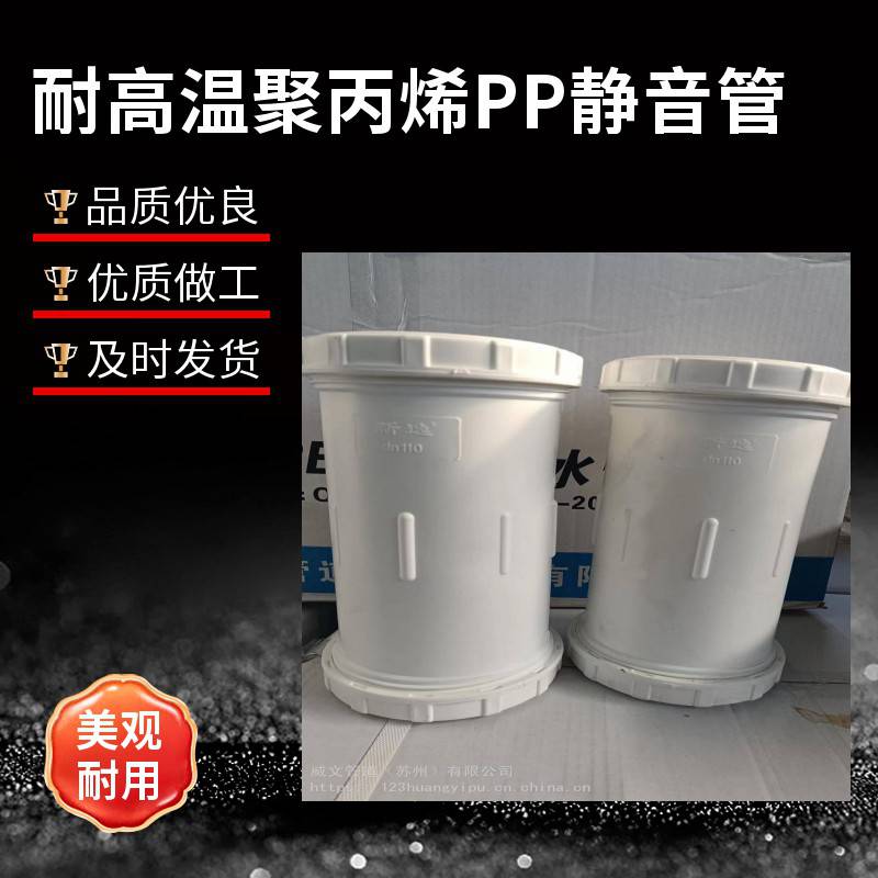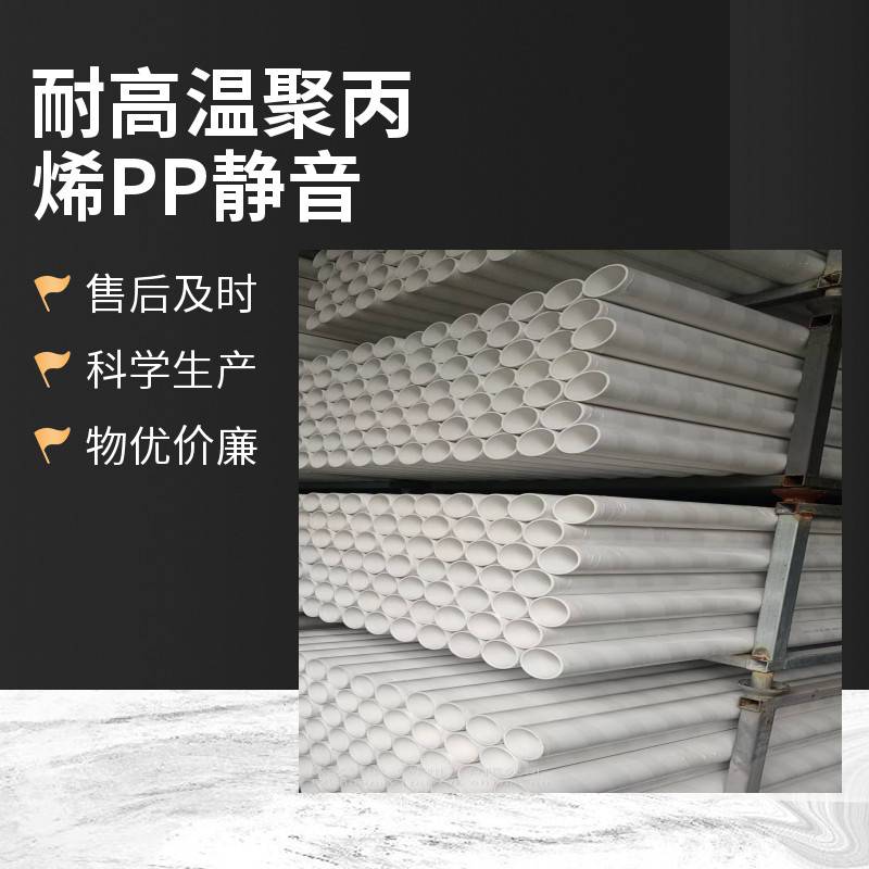 PP静音排水管:优点:1、耐热程度高,可耐95℃温度;2、承受水压0.5mpa,高于标准0.1mpa;3、化学稳定性好(除了强氧化剂及非极性溶液能使其降解);4、高绝缘性,不吸水,不受湿度影响;5、耐化学腐蚀性PH2-PH12;6、安装方便,柔性连接;7、环保;噪音低8、使用寿命可达50年。缺点:1、很难制成阻燃产品,熔点为164℃-170℃;2、低温下易脆化、不耐磨、脆化温度为-35℃,因此不适合0℃以下使用,但通过添加聚乙烯可适当改变这种情况;3、耐紫外线性能、抗其他穿透性能差,但可通过添加氧化锌等改善此性能。